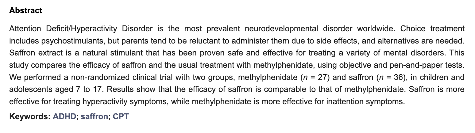 A couple of months ago I was listening to The ADHD Women’s Wellbeing Podcast1 and the guest, Lucinda Miller, mentioned a study that I could not believe was real - that saffron (like, the spice used in paella, which FWIW I always thought was kind of blech tasting) was recently found in a study to be as effective as methylphenidate (often sold under brand name Ritalin) in treating some ADHD symptoms (namely hyperactivity)).